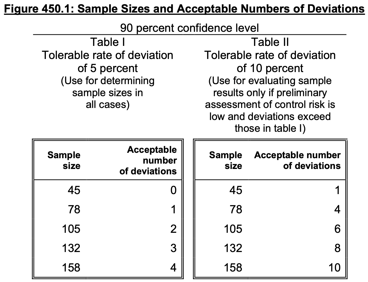 Figure 450.1 from the FAM 450 indicates that with a sample size of 45, if an auditor observes zero deviations, they can reject with 90% confidence the null hypothesis that the population deviation rate is greater than the tolerable rate of 5%, and declare the controls effective. On the other hand, if an auditor observes even one deviation in the sample, they will _fail to reject the null hypothesis_ that the controls are ineffective. This wording is very important because failing to reject the null hypothesis is __not__ the same as being able to claim the controls are ineffective—_an auditor who observes even one deviation cannot declare that the controls are ineffective_. This is analogous to how courts declare someone not guilty due to lack of evidence, rather than declaring them innocent.